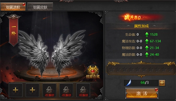 3、羽翼皮肤系统中,玩家可收集皮肤碎片来激活对应的羽翼皮肤,激活后将获得对应的属性加成。若获得重复的碎片,可用于提升该部位碎片的属性。