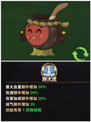 最大生命值额外提升20%,攻击速度额外提高20%,伤害加成额外增加20%,运气额外增加20点,初始拥有1把棒球棍。