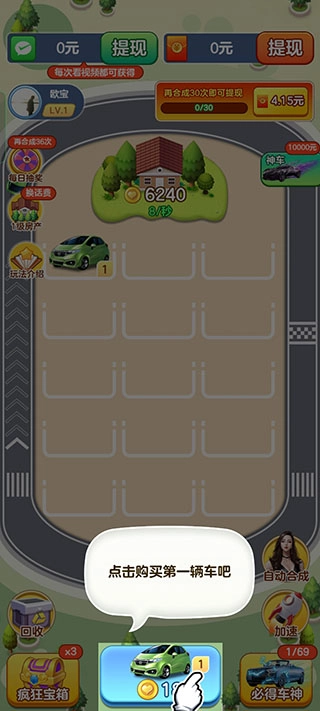 2、先点击下方的按钮购买一辆车,接着把两辆相同的车合成,就能得到新的车辆。