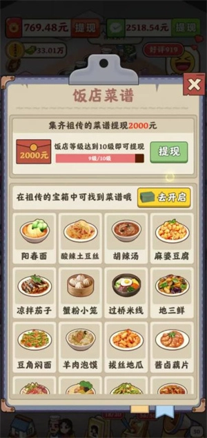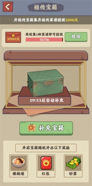 1、直接说总结,是不能提现的。一开始得靠开祖传宝箱来收集菜谱,要是把菜谱都集齐了能提现2000红包,但等你快要把菜谱收集齐的时候,得看270次广告才能开宝箱。