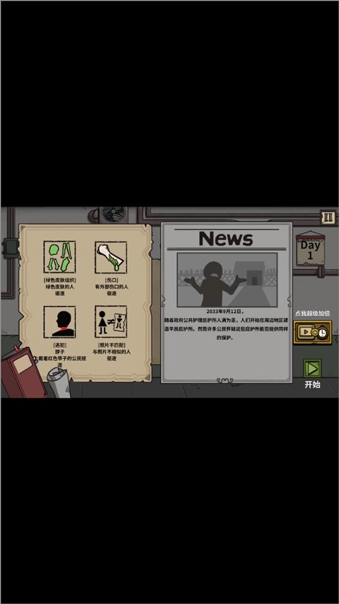 2、游戏第一天,玩家要驱逐僵尸并前往平民庇护所。到达后,需在限定时间内找出并驱逐有问题的人,若未在规定时间内达成目标,任务将失败。