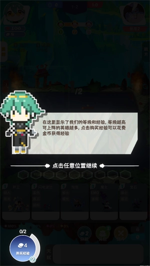 4、等级越高,能上阵的英雄数量就越多;点击“购买经验”按钮,消耗金币即可获取经验。