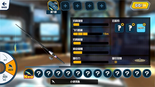 3、确定好钓鱼点后,接下来要挑选钓鱼装备。不同的装备能钓到的鱼是不一样的,选好装备后,点击右上角的GO按钮就可以开始钓鱼了。