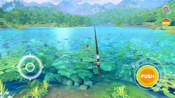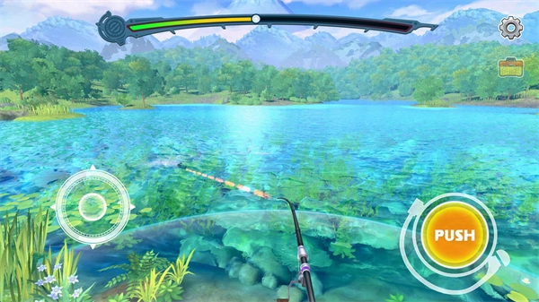 4、正式开始后,通过左侧控制鱼漂的位置,点击右侧的push按钮即可抛出鱼竿、投下鱼饵。
