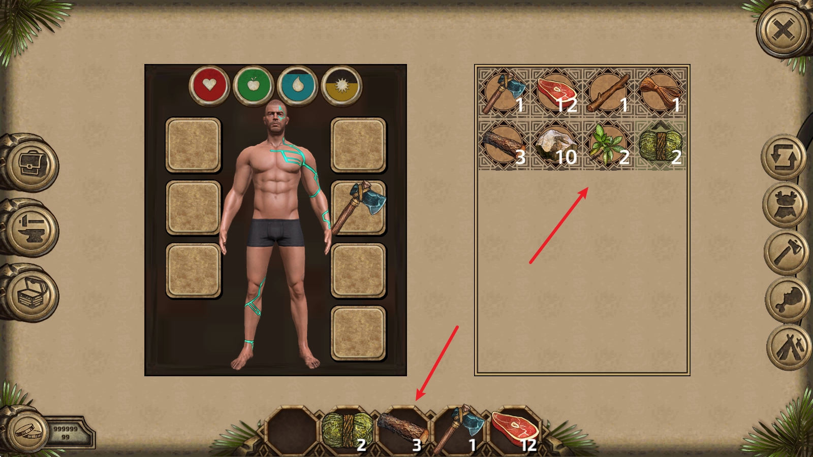 3、在界面的右上角能够查看自身的状态属性,当这些属性数值不足时,需要通过食用对应的食物来进行补充。