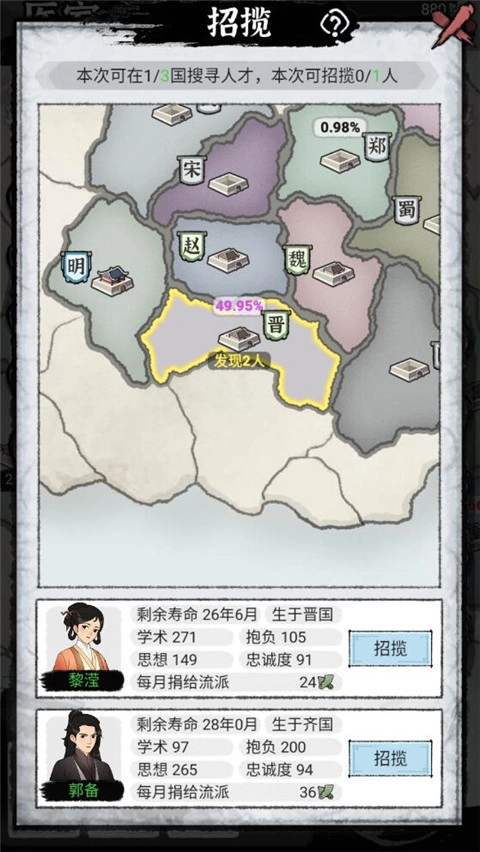 2、吸纳门生 — 不同势力的人才各有特点,有的侧重学术,有的侧重思维,有的则侧重抱负……身为一派之主,在不同阶段招纳合适的门生,同样能增强学派的竞争力。