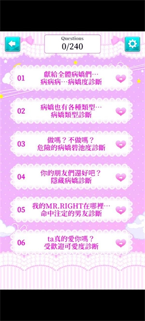 病娇诊断借助一系列设计巧妙的问题,助力玩家探寻自身是否存在病娇倾向。该产品的亮点在于,其测试题目既紧跟潮流、贴合年轻人的兴趣点,又由心理学专家精心打造,保障了测试的科学性与精准度。玩家通过轻松点击屏幕回答各类问题后,系统会呈现详尽的诊断结果,使玩家能直观地认识自己的心理状态。