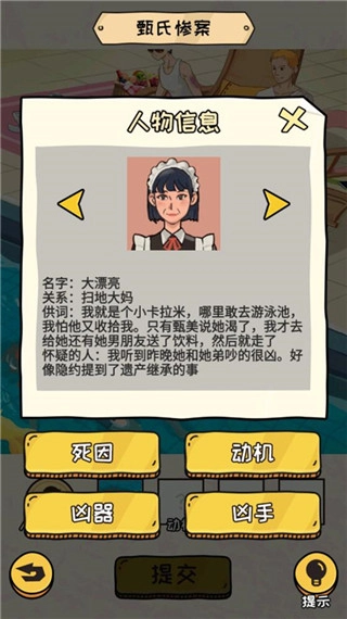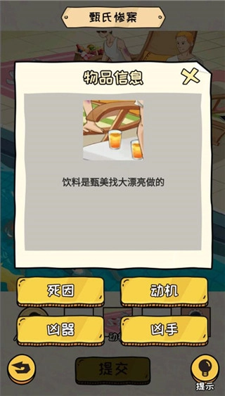 1、这是案件介绍,有一位名叫小美的人遇害了,需要玩家找出杀害受害人的凶手、作案凶器、犯罪动机以及受害人的死因。