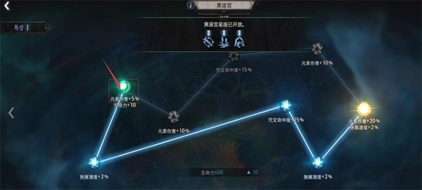 黄道宫内设有6个可解锁的星座群,玩家解锁不同星座群可获取对应力量。这些特性点决定玩家技能发展方向的差异,玩家达到10级后,每升一级获得1点特性点,可在星座群中分配。