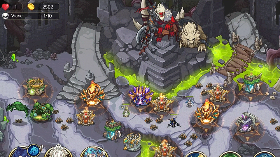 2、防御塔类型丰富多样,涵盖兵营、魔法塔、炮塔、弓箭塔等,每一种防御塔都具备独立的升级系统以及独特的进化展示效果。
