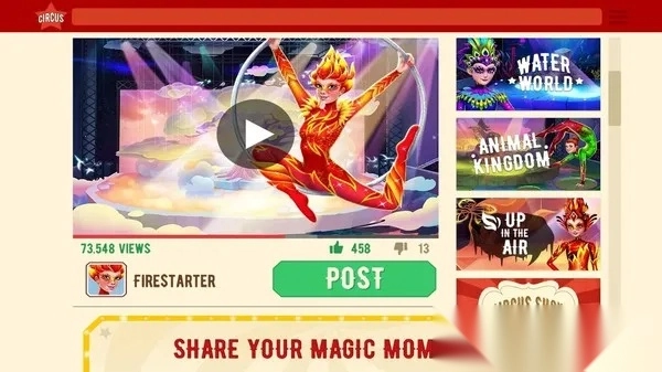 游戏画风色彩鲜艳,视觉效果十分出色。玩法别具一格,围绕马戏团主题展开,你可以编排成员的表演动作,为杂技演员搭配华丽的服装。升级马戏团还能解锁更多动作、服装等内容。