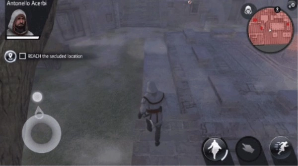 1、设置了两种操控模式,一种是类似PC端的点击移动方式,另一种为双摇杆模式,更适配操作习惯。针对移动端特性,攀爬、跳跃等动作均做了简化处理,玩家只要靠近障碍物便能自动触发对应动作。刺杀操作也更为直观,点击敌人头部上方的骷髅图标就能完成刺杀。