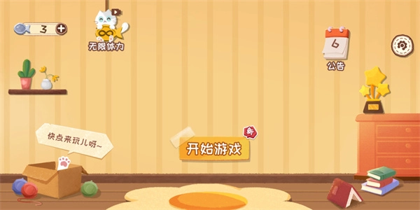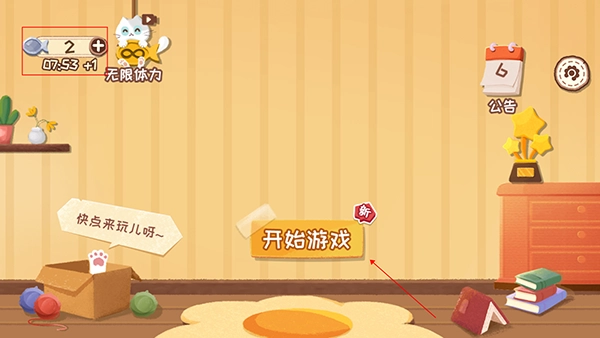 1、玩家进入主页后,能在左上角看到自己剩余的体力值。点击“开始”按钮,就能开启收纳之旅。