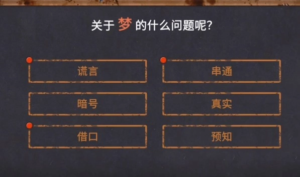 4、第三关的提示涉及梦境与谎言,玩家需选择“谎言”选项,缘由是串通和借口都属于无意义的言辞。