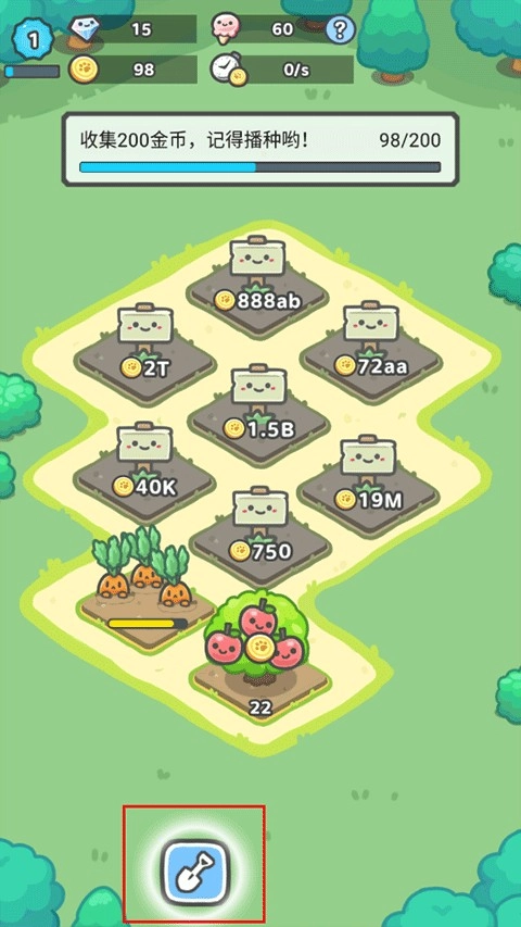 3、点击屏幕下方的铲子即可切换至种植模式,长按该按钮就能快速种植农作物。