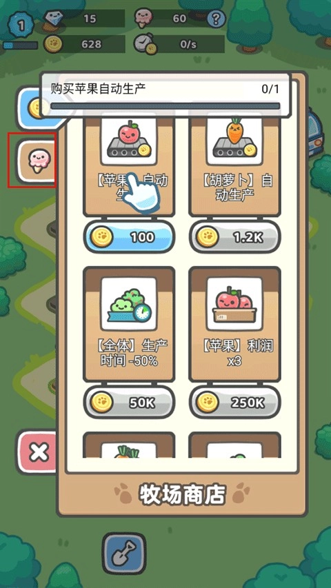 4、点击左上角的牧场商店按钮,花费金币购买“苹果自动生成”功能,也可以选择雪糕、提升等级,以此来增加牧场的收益。