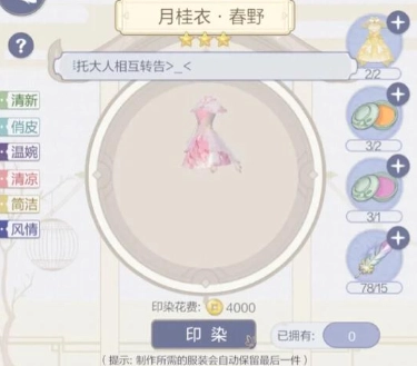 3、点击“服装印染”选项,能够对服装的花纹样式、整体风格等方面进行调整与改变。