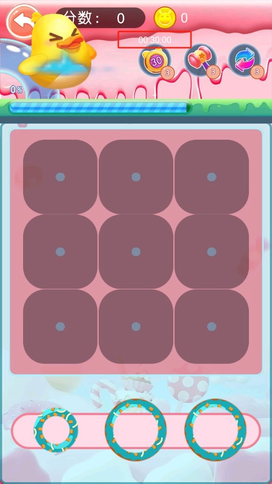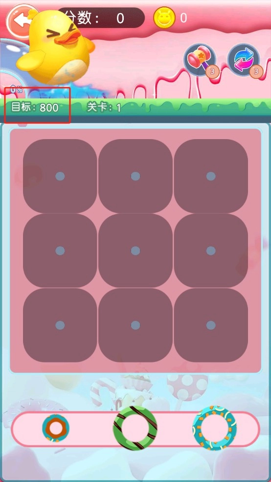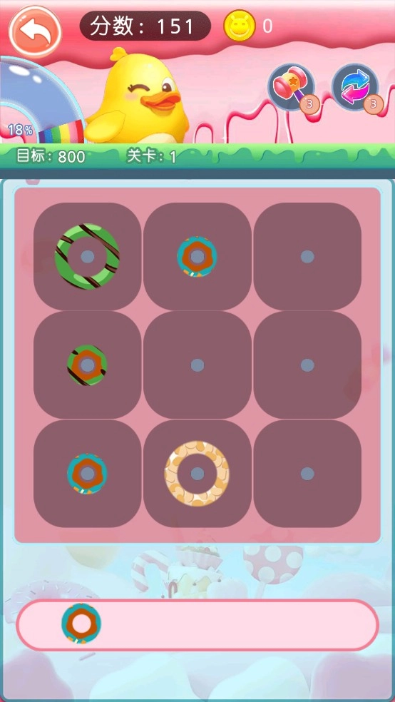 3、把三个一样的甜甜圈凑到一块儿,就能完成消除并拿到分数,合理安排布局能让通关速度更快。