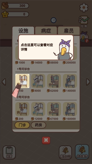 3、若要为患者提供治疗服务,第一步需购置诊台。点击“装修”选项,查看医院设施的详细信息,从中选择“诊台”并完成购买,之后就能正式开始接待患者了。
