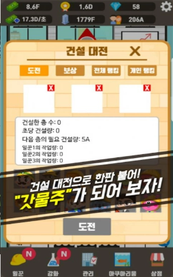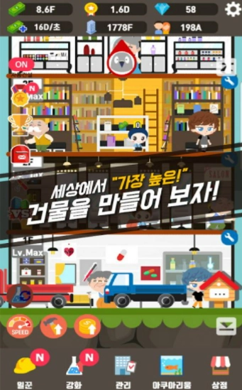 建造大楼模拟器(건물키우기),单手即可轻松操作,玩家能建造各类大楼与建筑物,房屋种类丰富多样。游戏采用3D画面,代入感十足,玩法自由无限制,适合各年龄段玩家体验,还提供丰富的道具与资源,感兴趣的小伙伴快来试试吧!