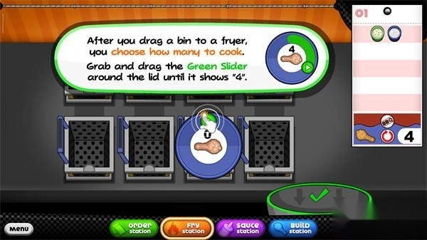 8、把盒子拖入炸锅后,你可以通过抓住并拖动盖子周围的绿色滑块来选择烹饪数量,将滑块调整到显示“4”即可。