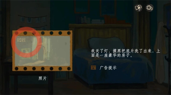 7、把底片放进盘子并加入显影剂,会得到照片和数字1920;将钥匙合并后翻转,可得到字母K;之后在相机背面输入密码“19201018”,再插入钥匙就能获取地图。