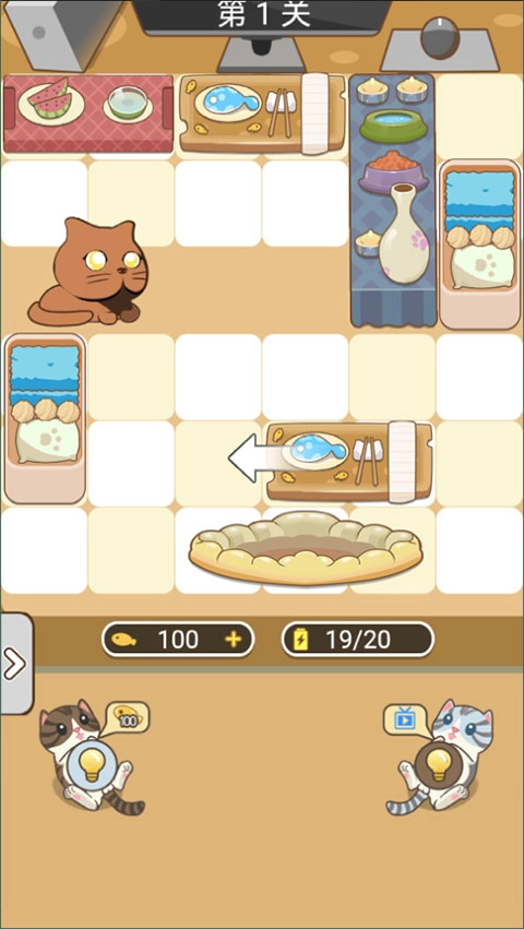 3、这是玩法超简单的华容道,玩家需要对比障碍物的长度与方向,通过移动障碍物,帮助可爱的小猫咪成功脱险。