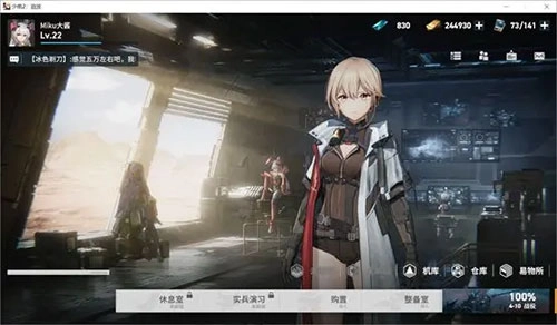 右下方的机库是局内支援技能。下方的休息室(宿舍)和实兵演习(PVP)还没开放,购置是抽卡界面,整备室是角色养成界面,现在进入整备室。