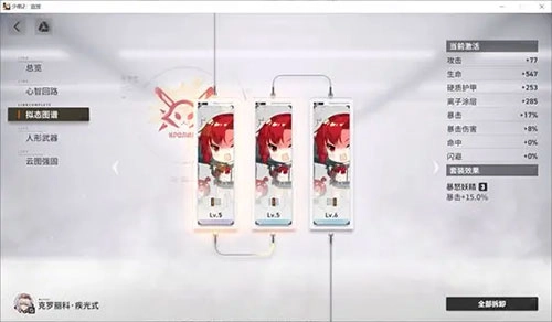拟态图谱其实就是《少女前线》1代里的妖精,不过妖精被划分成了三个部分,而且每个妖精都具备两件套和三件套的套装属性。妖精的主词条名称是固定不变的,左边的主词条是增加血量,中间的是增加硬质护甲,右边的则是增加离子涂层,这些属性会随着妖精稀有度和等级的提升而提高。妖精的稀有度从高到低依次为金、紫、蓝、绿,它们在0级时分别对应拥有4到1个随机副词条。每强化五级,就能够强化一个已有的随机副词条或者新生成一个随机副词条。