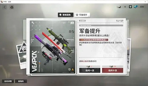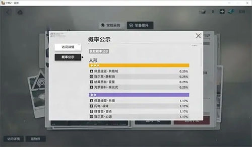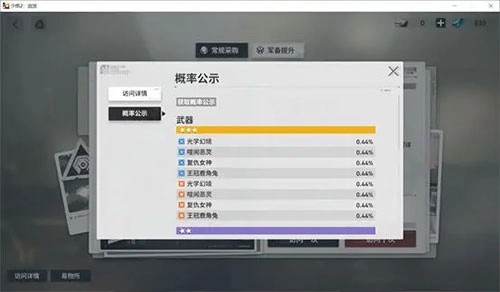 另一个是军备提升,也就是武器池,在这个池子里只能抽取到所有武器。10连抽保底会出一个紫色稀有度的武器或角色,60连抽则保底出金色稀有度的物品。军备提升的综合出金率为3.52%(该概率是计算保底机制后的结果)。