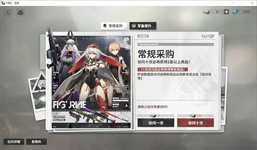两个卡池共用同一种抽卡券,但保底次数不共享。每次使用访问许可后会获得提取凭证,在易物所的人形堆栈中,可消耗200张凭证兑换任意三星武器(从名称推测,未来或许也能用来换购人形)。