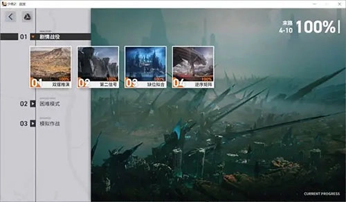 下面进入作战界面:该界面主要包含三个板块,分别是剧情战役、困难模式与模拟作战。