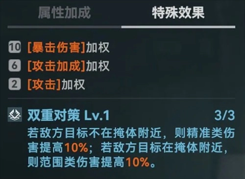 ②双重应对策略:当敌方目标处于非掩体区域时,精准类伤害提升10%;当敌方目标位于掩体周边时,范围类伤害提升10%。