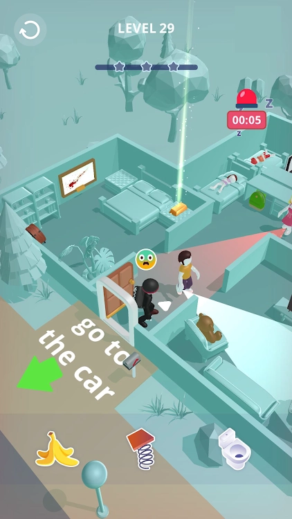 2、超酷的关卡冒险,规划好路线再开始挑战,体验惊险刺激,小心别被房间主人发现哦。