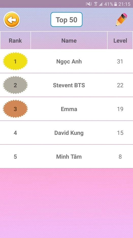 这是一款以防弹少年团成员为主题的猜名答题游戏,是粉丝们的专属福利哦!玩家只需根据成员的外貌特征猜出对应的名字,操作和玩法都十分简单。而且游戏占用内存小,随时随地都能玩,还在等什么呢,快来挑战一下吧!