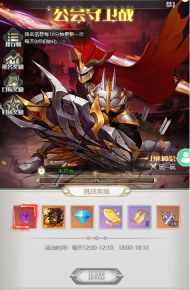 活动的举办时段是每日的12点到12点10分,以及18点到18点10分。奖励类型包含挑战奖励、排名奖励、目标奖励与归属奖励,具体的奖励图示可见下方(温馨提示:参与活动需先加入公会)